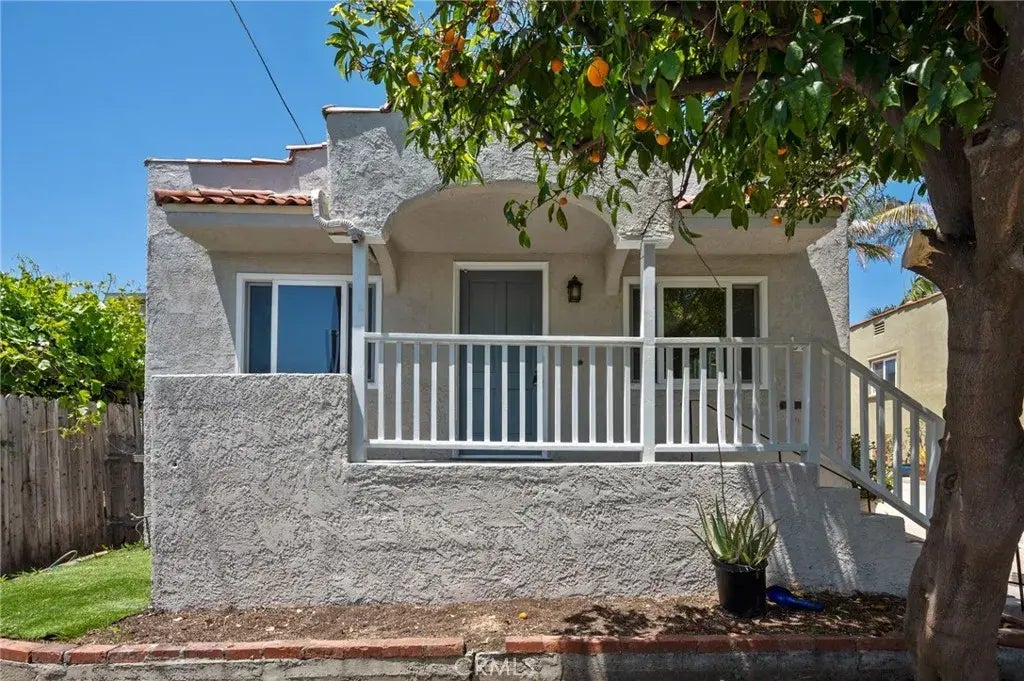 This charming 2-bedroom, 1-bathroom Spanish-style home is located in a peaceful neighborhood of San Pedro and offers approximately 864 square feet of cozy, light-filled living space. Inside, you'll find beautiful hardwood floors throughout, with tile in the kitchen and laundry room for added durability. The front porch overlooks a terraced front yard with a fruit tree and provides a welcoming entrance, opening to the main living space, which features a decorative brick fireplace and combined living and dining areas. The kitchen, overlooking the main living area, boasts wood cabinetry, natural light, and plenty of storage. A separate laundry room is conveniently attached to the kitchen and includes a washer and dryer. Built-in storage can be found throughout the hallway, bedrooms, bathroom, laundry room, and the detached one-car garage, which also includes an additional utility room. Recent updates include new windows, fresh tiles in the bathroom, and the entire interior has been painted for a clean, move-in ready feel. One of the bedrooms features a door that opens directly to the backyard, providing easy access to your private outdoor retreat. Enjoy the private, brick-paved backyard perfect for relaxing or entertaining. This well-cared-for home blends timeless charm with everyday comfort in a desirable location. Dont miss your chance to make it yours!