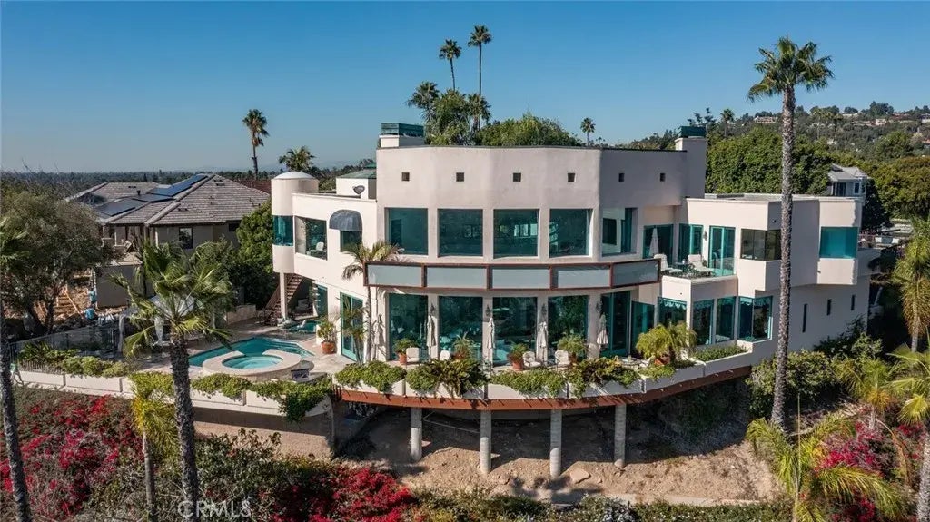STUNNING 270 DEGREE PANORAMIC VIEW * END OF CUL DE SAC * ICONIC MODERN ARCHITECTURE...A residence of such caliber seldom becomes available on top of Red Hill Ridge, & even rarer to find one at the end of a cul-de-sac offering unobstructed panoramic-like views from mountain peaks to the coast & Catalina on a clear day. Combining steel construction, custom copper elements, & orchestra inspired architecture, this gated estate is designed for luxe living & exquisite entertaining. Enter through the remarkable copper front door & step down to a formal living & dining room inviting you in with a dramatic high ceiling & lots of windows to enjoy the views. The gourmet kitchen features a copper hood, built-in subzero fridge/freezer, wine cooler, trash compactor, granite counters, sandstone flooring, built-in desk area, walk-in pantry, & breakfast nook. The family room offers a double-sided fireplace & bar with copper details & a wine fridge. The bath with dual vanities off the family room serves as a great pool bath next to 1 of the 3 large sliders allowing for direct yard access. Outside, enjoy a heated pool, in-ground spa, built-in BBQ, & covered dining areas. Copper details cohesively flow outside with an exterior copper awning & partial copper roof with solar tubes to heat the pool. A great layout for all lifestyles, upstairs is divided into 2 wings, with the master separate from the remaining bedrooms. Head upstairs and take notice of the tiered ceilings, copper railings, orchestra-like balcony off the den & guest area living/loft including fireplace. A painted faux stone wall