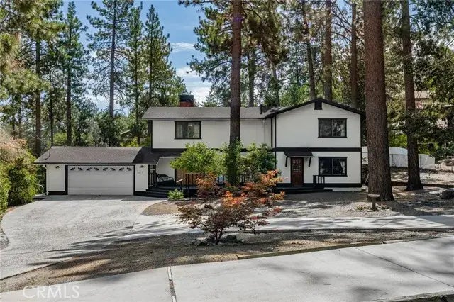 Welcome to 5977 Mill Rd in Wrightwood, nestled among the trees in the forest. Mill Rd is situated on the coveted west side of Wrightwood, within the newly established "Big Horn Estates" area. The home is perfectly positioned on an over 1/2-acre lotone of the larger in the neighborhoodoffering ample space for expansion, additional buildings, or even an ADU. A large circular driveway with room for multiple cars leads to an expansive wood deck at the front door. As you approach, youll notice a separate entrance to the right, which provides direct access to the family room and stairs leading to the bedrooms. This space could easily be converted into a lockout or rental unit. Upon entering the main front door, youll be greeted by plush mountain carpet and wood-beamed ceilings. The formal living room features generous seating, real oak paneling, and a brick wood-burning fireplace. This room opens into the kitchen, which boasts a peninsula with barstool seating, stainless steel appliances, and a cozy table area with views of the front yard. Down the hallway, youll find a full guest bathroom and a bedroom. To the right, there is a family room with built-in cabinets and stairs leading to additional bedrooms. This area also provides access to the extra front door. Upstairs, there are two more bedrooms that share a hall bathroom. Additionally, there is an indoor laundry areaan uncommon feature for a home built in 1982. Beyond this, the primary suite includes dual walk-in closets, a primary suite bathroom, a spacious bedroom with a brick wood-burning fireplace, and a sliding glass door
