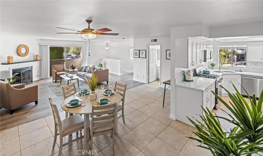 Vacant, go direct anytime. Time on market is due to giving a tenant 60 days notice then making the property accessable and in good showable condition. Bright & sunny, front corner unit with direct access to 2 oversized parking spaces (with additional lockable storage), in your attached parking garage. There are 3 separate balconies with sliding glass doors for you to step out into the fresh air and expand your views. The full sized laundry is conveniently located in the hall closet between the 2 large bedrooms. The kitchen was recently remodeled with sleek quartz counters on new shaker cabinets. There is a gas range and stainless steel appliances (Built in microwave and dishwasher), vinyal plank and tile floors everywhere except the bedrooms and a large pantry in the kitchen extending to the underside of the stairs. The HOA is incredibly low at only $200. Who needs a yard to maintain when you can enjoy the neighborhood park across the street with a grassy play area, picnic table, BBQ and playground equipment. The location is legendary with some of the best schools in the county and The Katella Deli, Costco and Cottonwood just a simple stroll away. There is central AC & heat accompanied by ceiling fans. There are also fireplaces in the living room and the primary bedroom. I believe this one will check every box on most shoppers' lists, so you can imagine it may not be available long at this price.