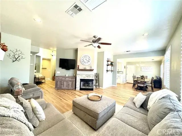 Discover your slice of desert paradise in beautiful Yucca Valley! This spacious turnkey property offers stunning panoramic views of the San Jacinto Mountains and the breathtaking Joshua Tree landscape. Situated on 10,000 sq ft, this 1,472 sq ft home features a well designed layout with 3 bedrooms and 2 bathrooms and stunning hardscape outdoor spaces. The kitchen has a walk in pantry, plenty of cabinets and new quartz countertops. The light filled living room with fireplace, seamlessly flows into the dining area, creating an inviting atmosphere for gatherings. The spacious primary bedroom, features a walk in closet and an ensuite bathroom, equipped with modern fixtures and a dual sink vanity, ensuring privacy. The other two bedrooms are generously sized, featuring carpet flooring and ample closet space. The second bathroom is a full bathroom with stylish touches. The home features an enclosed nook, currently utilized as an office space, providing both privacy and convenient access to the backyard. Other features include updated vinyl flooring, central a/c and an evaporative cooling system. In addition, the home offers dual pane windows, shutters and ceiling fans throughout. Step outside to see the beautifully designed hardscape, ideal for entertaining, lounging, or enjoying the breathtaking desert sunsets. Direct access garage offers storage shelf and storage cabinet. Gated RV parking and large driveway provides ample room for multiple vehicles. This home is conveniently located near shops, restaurants, and outdoor adventures, and has the perfect blend of comfort and accessi