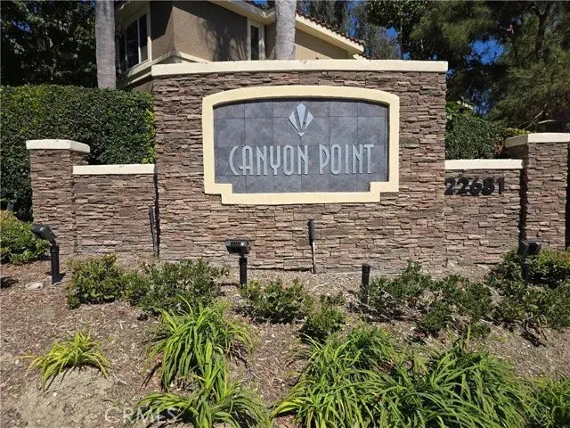 Beautiful 2nd floor view condo in Canyon Point Community. Approximately 792 sq. ft., 1 bedroom, 1 bathroom, full size laundry, open floor plan. The kitchen opens to the large living room with its romantic stone fireplace and scenic views. The living room flows right into the dining room with more views and custom pendant lighting and built in cabinets. The bedroom is large with views. The bedroom also has a large walk-in closet with custom closet organizers. The long patio spans the living room and bedroom. The bathroom is oversized and fully remodeled. The kitchen has granite slab counter tops, stainless refrigerator, stainless oven and microwave. The kitchen also has dishwasher, pantry with washer and dryer in a separate room. This home also features A/C, high ceilings, crown moldings, plush carpet, recessed lighting, ceiling fans in the bedroom and living room. This home comes with one assigned parking space. The community has a pool, spa, clubhouse, gym and many local hiking paths. We are located near Soka University and the 73.
