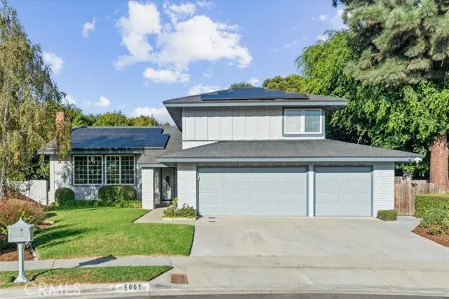 This spacious tri-level home on a huge lot with a 3 car garage is an example of Yorba Linda gracious living. The 5-bedroom 3-bath home hasan impressive 2,630 square feet of living area on a9,600 square footlot and includes a bedroom and bath downstairs. Double door front entry opens to a welcoming foyer. The newly painted interior and exterior provides a fresh, modern feel. Plank flooring in the kitchen and family room. Many upgraded windows. The stunning gourmet kitchen has a large island with bar seating and is great for entertaining and gatherings. Built-in stainless appliances including a Sub-Zero refrigerator, double ovens, dishwasher and wine refrigerator. Abundant custom cabinets and designer lighting and fixtures. Built-in breakfast nook includes a matching table. Large formal living room with vaulted ceiling and fireplace. The step-down family room features a second fireplace and built-in custom cabinetry and opens to your tranquil patio and beautiful yard. Formal dining room adjacent to the kitchen and living room. Spacious primary suite upstairs with walk-in closet. 3 more bedrooms upstairs along with a second full bath with double sink vanity. The 5th bedroom has a built-in desk and is ready to be your home office. Mirrored closets in most rooms. Indoor laundry area includes washer and dryer. A spacious, park like professionally landscaped back yard and wide side yards enhance this propertys appeal. There is plenty of room for a pool and much more. Energy efficient solar will save you money. Desired 3 car garage with newer opener and wide driveway for additional