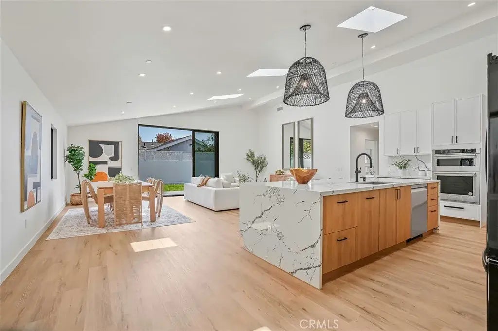 Step into a stunning blend of modern luxury and flawless functionality in this newly completed 2024 renovation. Every inch of this home showcases high-end craftsmanship, offering four bedrooms, 2.5 bathrooms, and 2,529 sq. ft. of sophisticated living space. From the moment you arrive, the attention to detail in every aspect of the renovation is evident. Every system in the home is brand new: roof, gas line, plumbing, electrical, windows, a tankless water heater, and HVAC system. At the heart of the home is the expansive great room, boasting high vaulted ceilings, skylights, and oversized sliding doors that create a seamless indoor-outdoor flow. The designer kitchen is an entertainers dream, featuring a stunning Calacatta Vega quartz waterfall island, custom cabinetry, and a striking Venetian plaster range hood. A built-in bar with a wine fridge provides the perfect setting for hosting or enjoying quiet evenings at home. The primary suite is a true retreat, complete with high ceilings, French doors leading to the backyard, and a luxurious en-suite bathroom with dual sinks, a double shower head, and a private water closet. The additional bedrooms, including a versatile space perfect for a home office, are generously sized to meet the demands of modern living. The second bathroom showcases sophisticated finishes, a bathtub, and dual sinks, while a stylish powder room is ideally located for guests during gatherings. The laundry room, walk-in pantry, and new LID system for sustainable water management all contribute to the home's thoughtful design, blending practicality with mod
