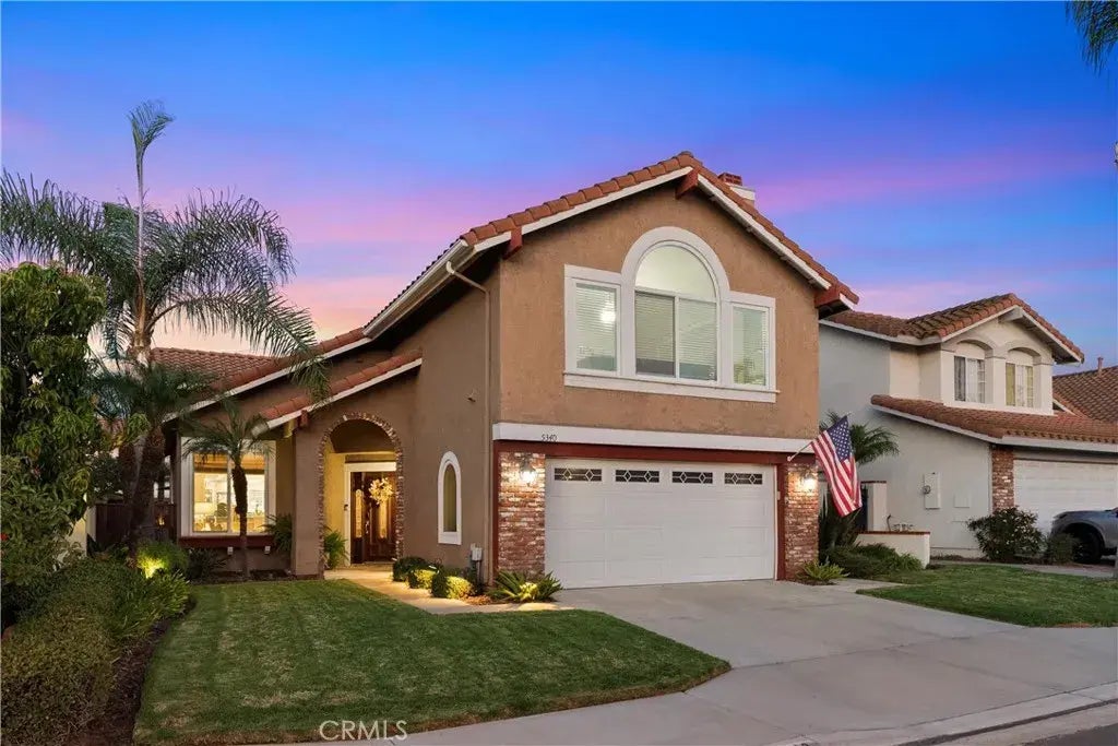 Welcome to this exquisite dream home located in the prestigious East Lake Village of Yorba Linda! This stunning 4-bedroom, 3-bathroom home, complete with a bonus room, offers 2,796 square feet of elegant living space on a 5,000 square foot lot. As you enter, the grandeur of high vaulted ceilings, the sweeping curved staircase, and travertine tile flooring greets you, setting the stage for the timeless class and modern comforts that make this property truly exceptional. The heart of the home is the well-appointed kitchen equipped with granite countertops, a stunning kitchen island with a convenient vegetable sink and bar seating, a paneled refrigerator, and high-end appliances, including a Thermador 6 burner gas stove and oven and a wine fridge. The kitchen flows seamlessly into both the family room and formal living and dining areas, creating an abundance of natural light, which provides an inviting and open atmosphere perfect for gatherings. The family room is a cozy retreat featuring a charming fireplace and custom built-in shelves, perfect for relaxing evenings with the family. Down the hall, there is a main floor bedroom and a full bathroom with a step-in shower, ideal for guests or multi-generational living. Upstairs, you will appreciate the rich hardwood flooring throughout the remaining bedrooms and bonus room. The primary suite is a spacious haven with a double door entry and walk-in closet. The ensuite bathroom offers a dual sink vanity with granite counters, a walk-in shower with a glass enclosure, travertine accents, and a waterfall shower head. The remaining bed