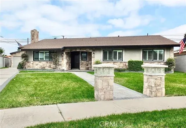 This super sharp 3 bedrooms, 1 3/4 bathrooms, single family residence in Huntington Beach, has been redone inside & out. Exterior has one of a kind brick and stone work. Ring security cameras surround the home with motion detection lights. Smart lights are automatic dusk till dawn. There are electrical outlets under eves for both the house and the garage. Central heating and air, as well as an upgraded kitchen showcasing stainless steel appliances, and custom cabinets. Both bathrooms are nicely redone and there are plantation shutters throughout. In 2017 all new copper plumbing was installed. Get comfortable next to the beautiful, stacked stone fireplace in the living room. There is tiled flooring and all bedrooms are carpeted. Dual glazed windows, recessed LED lighting, and ceiling fans really make this home sparkle. The two car finished garage is detached with cabinets, extra storage, and fixed lighting in the attic. Air compressor in garage with air-fittings throughout. Separate Laundry room. Covered patio and professional hardscaping really brings this home to the next level.
