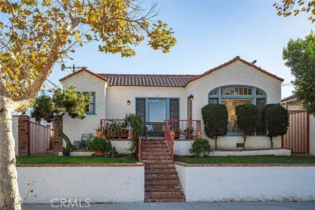 This classic Spanish-style home, built in 1923, sits on an elevated lot in the historic neighborhood of California Heights. An impressive walkway leads to a lovely brick front porch, showcasing its preserved original charm. Inside, you'll find arched-picture windows with side casement windows in the living and dining rooms, original oak flooring, coved ceilings, and arched entryways that add to its timeless appeal. The residence offers a formal living and dining room, along with two generously-sized bedrooms, each featuring a full en-suite bath. The primary bedroom offers privacy and has beautiful coved ceilings, while the other has plenty of sunshine with a sliding door that opens to the rear yard, with a private patio area, built-in planters, plenty of brick, and space for entertaining. Adjacent to the two-car garage, is another highlight of the property, which is a 400 sq. ft. permitted "workshop" which is completely finished and features laminate flooring, and a mini-kitchenette (sink, counter, cabinetry, and space for a small fridge) making it an ideal office space, home gym, entertainment space, or whatever you envision! Back inside the main house, is a light and bright kitchen with solid-surface countertops, updated cabinets, and stainless steel appliances. A cozy breakfast nook adds to the kitchen's charm. Conveniently located off the kitchen is a laundry room with plenty of storage, and a door leading to the side yard. Additional features of this home include a newer roof, copper plumbing, dual-pane windows in much of the house and workshop, a newer water heater, a