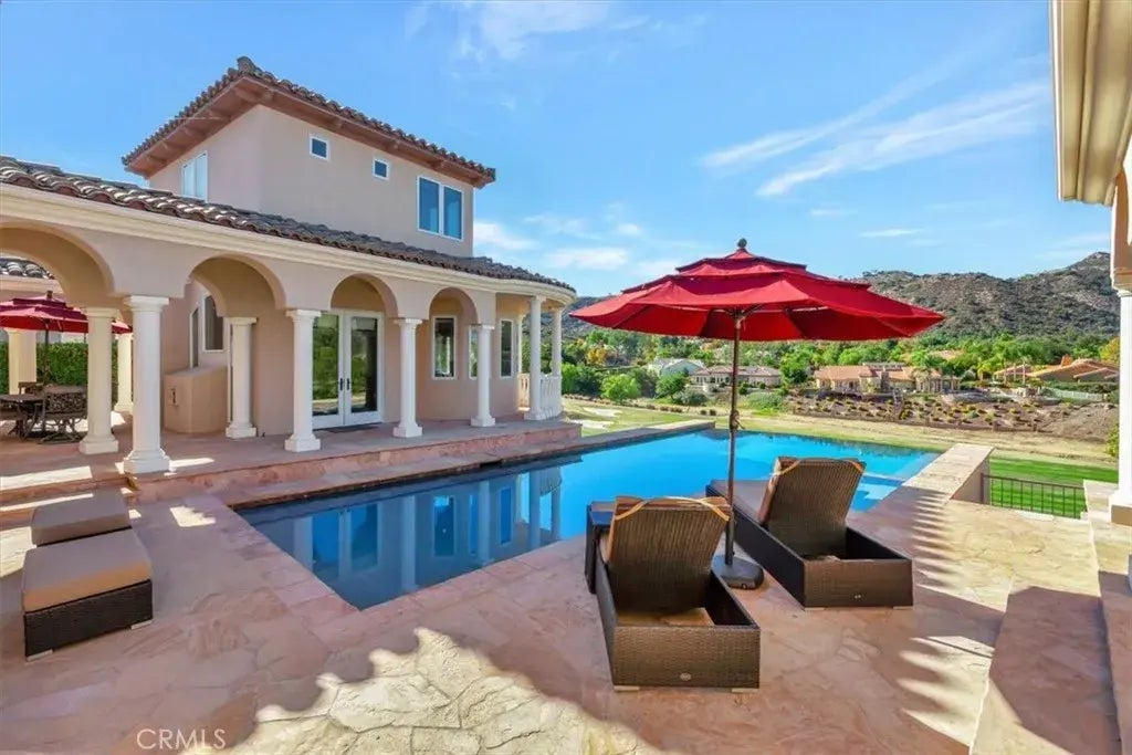 Welcome to the best of luxurious gate-guarded Bear Creek. Nestled in a prestigious, gated community, this exceptional Mediterranean-style residence offers unparalleled luxury and stunning panoramic views of the surrounding hills and award-winning Jack Nicklaus Bear Creek Golf Course. Boasting a timeless Tuscan design with a double-tile roof and Romanesque columns. This estate features 4 spacious bedrooms, 5.5 elegant bathrooms, and meticulously crafted living spaces. Oiled white oak floors, dramatic arches, and high ceilings enhance the homes elegance throughout. The grand entry sets the tone with an impressive, curved staircase leading to a second-floor loft and two bedrooms, each with a custom bath. The main level includes a gourmet kitchen equipped with top-of-the-line Viking appliances, including a double oven, 6-burner stove, center island with popup ventilation, Gaggenau grill, wok station, and fryer. The chefs kitchen seamlessly flows into the expansive living and dining areas, perfect for entertaining. The primary bedroom suite is a serene retreat with stunning views of the infinity pool and golf course beyond. It features a luxurious bath with a large walk-in shower, separate soaking tub, and a huge custom walk-in closet. In addition to the main residence, this estate includes a detached guest house with private bath, and a detached two-story office with a living area, fireplace, and a half bath, plus an upper-floor workout room with walk-in shower. For ultimate convenience, the property is equipped with a state-of-the-art Savant lighting system and electronic cont