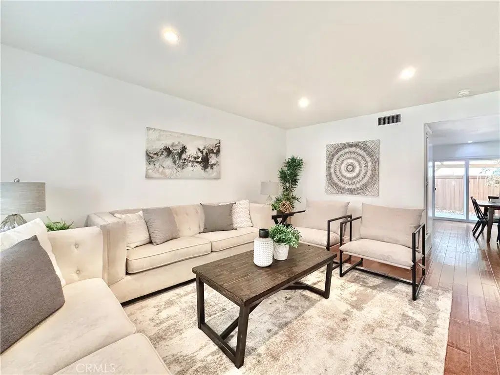 Welcome to this beautifully updated, turnkey corner-unit townhouse-style condo! Featuring 2 spacious bedrooms and 1.5 baths, this charming home offers modern comforts and timeless style, perfect for creating lasting memories. The heart of the home is the updated kitchen, which boasts bright white shaker cabinets with soft-close features, bronze hardware, white quartz countertops, and a classic subway tile backsplash. The Kraus sink and Samsung stainless steel appliances enhance functionality, while recessed lighting brightens the space. Step through the kitchen to a serene, covered patioideal for alfresco dining or relaxing in a tranquil outdoor setting. The living areas feature elegant maple hardwood flooring, complemented by hand-painted Talavera tiles on the stair risers, adding a unique and artistic touch. Upstairs, energy-efficient windows fill the two spacious bedrooms with natural light. The upgraded linen closet in the hallway ensures extra storage convenience. Both bathrooms have been thoughtfully remodeled. The half-bath downstairs includes quartz countertops and a modern cabinet, while the upstairs full bath features travertine tile flooring, a rimless glass shower, and a matching new cabinet. Practical upgrades continue with the stackable washer and dryer tucked neatly behind a custom barn door, plus a newer added pantry in the kitchen. Direct access to an oversized one-car garage and an additional assigned parking space complete the package. Centrally located near the 5 Freeway, The Orchard shopping center, and a variety of dining and retail options, this home