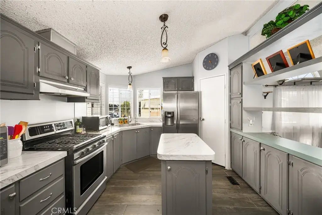 Fantastic opportunity to own a single-story 3 bedroom, 2 bathroom home with a spacious yard in a gated community. The inviting porch, open floor plan, and high ceilings provide natural light to welcome you home. The living room and dining area open to the kitchen and feature beautiful moulding, wood floors, a built-in workspace and full-house sound system. The kitchen features plentiful cabinets, a walk-in pantry, island, and stainless steel gas range, refrigerator and double-basin sink framed by windows. Down the hall, enjoy the convenience of a laundry room with built-in storage and a side door, two bedrooms, and an upgraded full bathroom. Retreat to the primary suite at the end of the hall, beautifully designed with a shiplap accent wall, large closet, and remodeled ensuite bathroom with custom vanity and quartz countertop. The home has great curb appeal. The lush front lawn leads to the tranquil front porch featuring newer decking and twinkle lights, and a spacious side yard to relax and unwind, BBQ or entertain. Additional amenities include central air and heat, a large storage shed, under-porch storage, Ring camera security system, vinyl fencing, and an extended awning and driveway to accommodate up to 4 cars. Community amenities include a pool, spa, gym, basketball court, playground, green space, billiards room, library, large clubhouse and laundry. Conveniently located near the freeway, train station, Santa Ana Zoo, shopping and restaurants. Don't miss the opportunity to call this beautiful home yours!