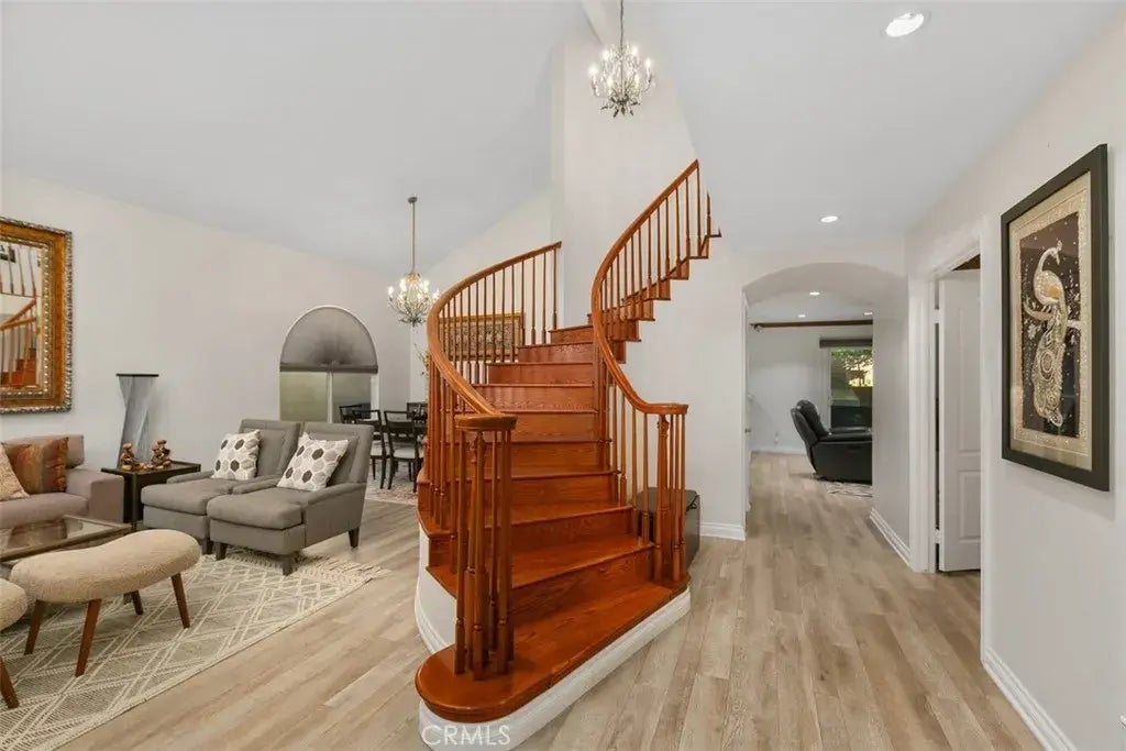 Gracious Living in Eastlake Village! From the gorgeous double door entry, this elegant turnkey 5 bed/4 bath home is complete with all the convenience of luxury. High ceiling semi-open floor plan with a main level bedroom & full bath accommodate overnight guests or home office. Luxury vinyl plank flooring throughout the entire house makes upkeep easy, while enhancing the ambiance of this lovely home. Enjoy cooking in the open kitchen with quartz counter tops, custom cabinetry, walk-in pantry, & upscale appliances all adorned by glass backsplash with eat-in breakfast area. A convenient wet-bar makes entertaining fun! Cozy up to the marble fireplace adorned by gorgeous oak shelving while watching TV in the family room then head up the elegantly curved staircase where you will find a double door entrance to the main primary ensuite with dual walk-in closets, well lit dual sink bath with soaking tub, separate shower, privacy toilet & granite counters to compliment the entire bathroom/dressing area. A wide hallway boasts two ample sized bedrooms with mirrored closets & updated third dual sink bathroom. The end of the hall leads to a mini ensuite complete with fireplace adorned by custom built-in oak closets & private bath. All bedrooms include ceiling fans & double pane windows. Separate laundry room with direct access to a 2 car garage which includes ample built-in cabinetry/storage & water softener system. Custom gates on either side of the home lead to an entertainers backyard! A completely covered patio with skylights to enjoy no matter the weather. Complete with built-in bar