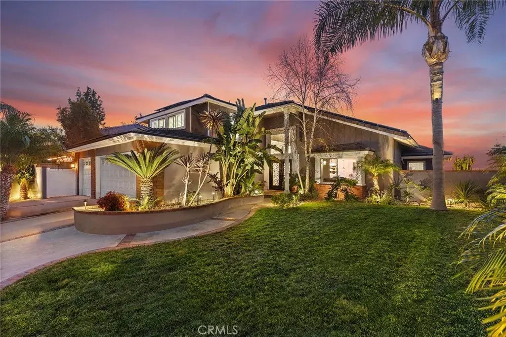 This is a fantastic home on a large lot with desirable amenities located in one of the best spots in Yorba Linda. What do people desire, how about a downstairs bedroom and remodeled bath, a beautifully remodeled kitchen, a spectacular backyard with pool, spa, firepit and low maintenance yard, several spaces for relaxing. Come on in and take a look. Double statement metal doors bring you in to the entry with a open living room and dining room, with French doors to the back patio, to the right or go left to the downstairs bedroom and bath and the family room. Lots of windows accent the loveliness of this home. The kitchen with an extra large island and plenty of storage and counter space was expanded and built with quartzite counters and an elegant tile backsplash. A six-burner stove with two ovens and a built-in microwave. A remodel was done that expanded the kitchen by about 100sf. The view from the kitchen is to the backyard from the garden window. This kitchen is a chefs delight. There is bar seating along one side of the island. The first level flooring is tile. The windows are double-paned. The tile flooring extends up the stairs with a decorative iron staircase. Step inside the double doors into the primary bedroom and bath. Remodeled with double sinks and a walk-in shower and soaking tub. Closet space plus a storage room or could be a sitting room or office. This was space discovered behind the wall and added about 100sf to the size of the home. The primary bedroom has a long balcony on the back side of the home that expands the view from this home. Two more bedrooms