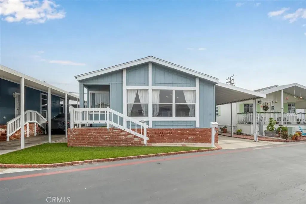 This 55+ Community home is situated in a very quiet and peaceful location in Highly Desirable "Rancho del Rey Mobilehome Estates. Convenient to the main clubhouse that offers heated pool and spa, sauna, billiard tables, practice putting green, banquet facility and much more. Originally a 3 bedroom home, one of the bedrooms was opened up to be included in the kitchen/Livingroom area to create more living space and open design. Interior features include a spacious kitchen with stainless steel appliances included, large kitchen island with storage space for cookware, quartz countertops throughout, recessed lights, wood laminate flooring, vaulted ceilings, spacious master bedroom with walk-in closet, separate tub and shower in master bath. Exterior features include covered carport for at least 2 cars, covered porch with nicely appointed brick and concrete hardscape.