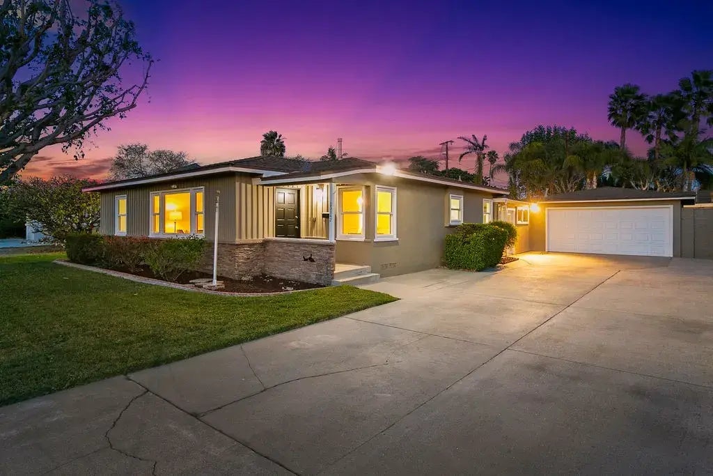 Welcome to your dream mid-century modern single-level home, blending timeless design with modern updates - Situated on an expansive lot, offering lush front & rear lawns, a detached garage, and an enclosed patio with endless possibilities. From the curb, imagine family gatherings with little ones playing on the spacious front lawn and vehicles easily accommodated in the extended driveway. Step through the charming covered porch into a warm and inviting interior, where refinished original narrow-plank hardwood floors greet you in the open-concept living and dining areas. Natural light streams through the dual-pane picture window creating a bright and airy ambiance in every corner. Modern conveniences abound, including new lighting, hard surface flooring, and fresh paint. The updated kitchen is a chefs delight, featuring quartz countertops, a clay-fired single-basin sink, a pull-out faucet, stainless steel 5-burner gas range and dishwasherand freshly painted custom cabinets. Adjacent to the central kitchen dining nook is a cozy family room with a raised hearth fireplace and skylight, perfect for relaxing or entertaining. The homes thoughtful layout provides privacy and comfort for all. Two front bedrooms, including one with a built-in Murphy bed, share a hallway bathroom complete with a walk-in shower and separate tub. Moving towards the rear of the home, youll discover ceiling to floor hall cabinetry, a secondary bedroom with built-in drawers, and the serene primary retreat. The primary suite features a modern walk-in closet, sliding doors to the verdant backyard, and an en-
