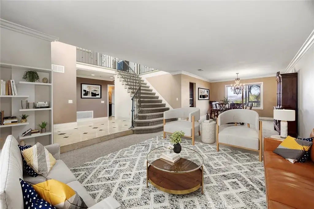 This beautifully upgraded Warmington home, crafted with quality, hand-picked materials, offers breathtaking panoramic views and an exceptional living experience. A grand marble entryway with a crystal chandelier, decorative banister, and oversized staircase greets you as you step into this impressive five-bedroom, four-bath residence, complete with an office and private entranceideal for work or guests. Designed for entertaining, the gourmet kitchen boasts a spacious center island, stainless steel appliances, and exquisite tumbled stone, marble, and granite accents. It seamlessly opens to the expansive family room featuring recessed lighting, a cozy fireplace, wet bar, and a wine closet with a charming wrought iron gate. A desirable downstairs guest bedroom includes a private bath and skylight, while upstairs, you'll find four generously sized bedrooms, including a luxurious primary suite with a romantic fireplace. The updated primary bath features a 12-jet Jacuzzi tub, providing a spa-like retreat. Enjoy seamless indoor-outdoor living with mountain and canyon views from the private covered patio, complete with built-in barbecue. The large, shaded side yard offers plenty of space for children to play. Additional features such as energy-efficient dual-pane windows, a thermal-lined attic with fans, and a 5-ton A/C ensure year-round comfort. Located in a prime area near top schools, shopping, and freeway access, this home offers unparalleled convenience. With stunning views from nearly every room and an endless list of amenities, this home is truly a must-see!