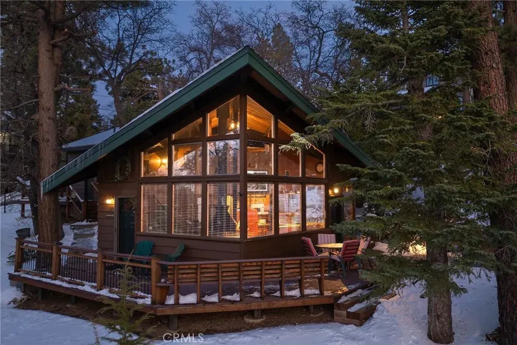 Welcome to your dream rustic retreat! This charming cabin, infused with a mid-century vibe, is located just four blocks from the renowned Bear Mountain Ski and Golf Resort, making it an ideal getaway for outdoor enthusiasts year-round. Step inside to discover a spacious living room, highlighted by a stunning round free-standing fireplace, perfectly positioned at its center and surrounded by 19 custom windows that fill the space with natural light and picturesque forest and ski slope views. The quaint kitchen features countertop dining, making it perfect for intimate meals, while ample storage closets throughout ensure you have plenty of space for all your gear. A cozy loft bedroom provides a peaceful sanctuary to unwind after a day of adventure. Embrace the beauty of the outdoors on the expansive wrap-around Trex decking, designed for relaxation and entertaining. The well-treed lot offers both privacy and a serene atmosphere, complete with a round retro hot tub vibe and a BBQ area for summer get-togethers. The fully fenced property provides peace of mind for families and pets alike, while the level entry 2-car garage comes complete with a convenient half bath, adding to the cabin's functionality. Whether you're looking for a weekend escape or a year-round home, this captivating cabin is a blend of rustic charm and modern convenience, ready to make lasting memories. Dont miss your chance to own this mountain haven!