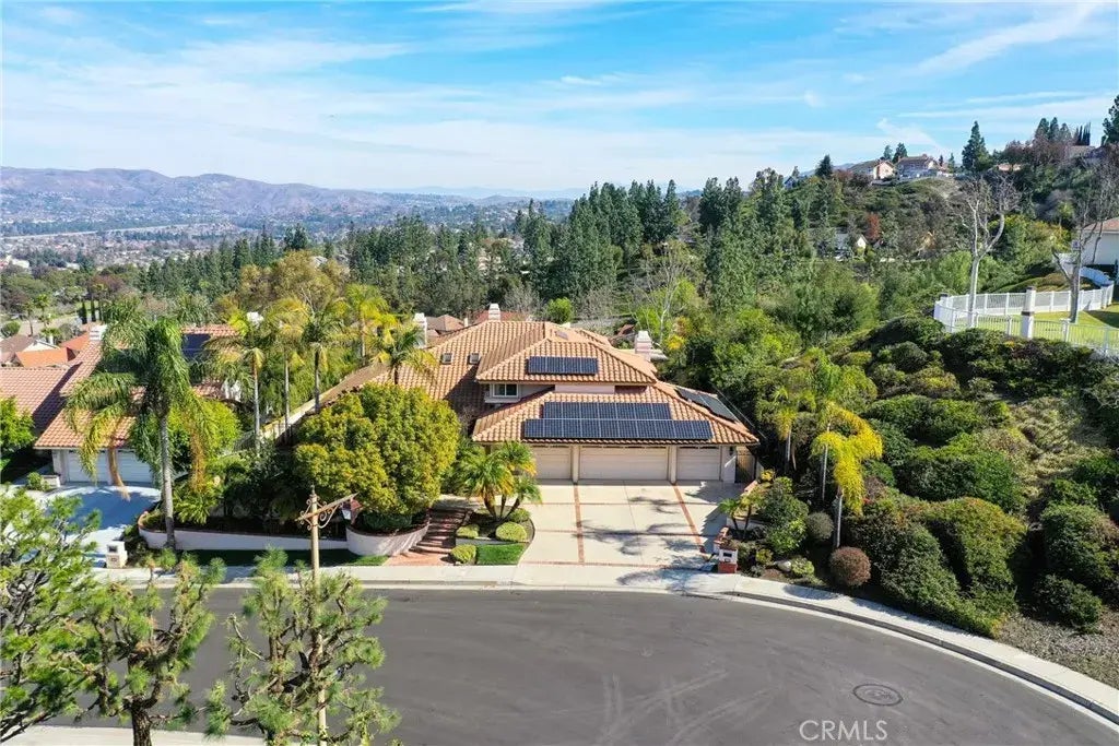 Dont miss this rare opportunity to own one of 8 custom homes in the exclusive Prado Woods cul-de-sac neighborhood of Anaheim Hills, available for the first time since being built in 1983. Breathtaking panoramic views from nearly every room. Set on a spacious 11,000 sq ft lot gives you the feeling of privacy and seclusion. Expansive 3,439 sq ft of living space featuring 4 bedrooms and 3 full bathrooms with a beautiful formal entry. Oversized 4-car garage spanning nearly 1,000 sq ft, complete with epoxy flooring, a workshop area, and plenty of storage. Main floor primary suite with a fireplace, skylight, and a remodeled (2022) en-suite bath featuring a jetted tub, walk-in shower, and large walk-in closet with mirrored wardrobe doors. Spacious kitchen with an island, eating area, and a new Bosch dishwasher, seamlessly connecting to the family and dining areas. Elegant formal dining room, ideal for entertaining. Versatile main floor bedroom with built-in shelving and a walk-in closet would be ideal for a home office. Main floor laundry room with a sink, counter space, ample storage, and direct garage access. Light-filled interior with high ceilings, skylights, plantation shutters, and numerous windows and sliders throughout. Ceiling fans and built-in features throughout the home. Three fireplaces located in the family room, living room, and primary suite for warmth and ambiance. Upstairs layout includes two spacious bedrooms sharing a full bathroom with a tub, plus a bonus room with a walk-behind wet bar, perfect for entertaining guests. Expansive sliders take you out to a larg