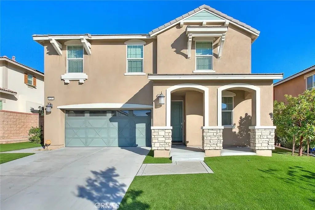 Welcome to this 2020 built beautiful 4 beds and 3 baths two-story home with picturesque mountain views located in a quiet neighborhood. It offers an inviting open floor concept, with a cozy fireplace with marble tile and wainscoting, with coordinating luxury vinyl plank flooring in the living area that flows into the dining space and spacious kitchen. The kitchen offers modern amenities, quartz counter tops island and plenty of cabinetry and counter space with two standard size pantries. Beyond the French doors, the beautifully landscaped patio with lush artificial grass boasts with outdoor furniture, barbecue area perfect for relaxing and ideal for entertaining, comes with garden area and with easy access to an oversized two-car garage featuring extra storage. The home has it all-comfort, style and views with drought-tolerant landscaping. Upstairs, youll find a versatile loft area, good for a home office, playroom, or additional living space and three generous bedrooms. Oversized Master bedroom and bath with separate tub and shower, dual sink vanity and large walk-in closet. The other two bedrooms have walk-in closets and natural color palette throughout the home, creates a serene and calming atmosphere. There is plenty of storage both upstairs and downstairs. Home comes with solar panel system and water softener enhancing energy efficiency and is conveniently located near shopping centers, schools, parks and major freeways ( 210 & 15). Dont miss out on the opportunity to make this place your own!