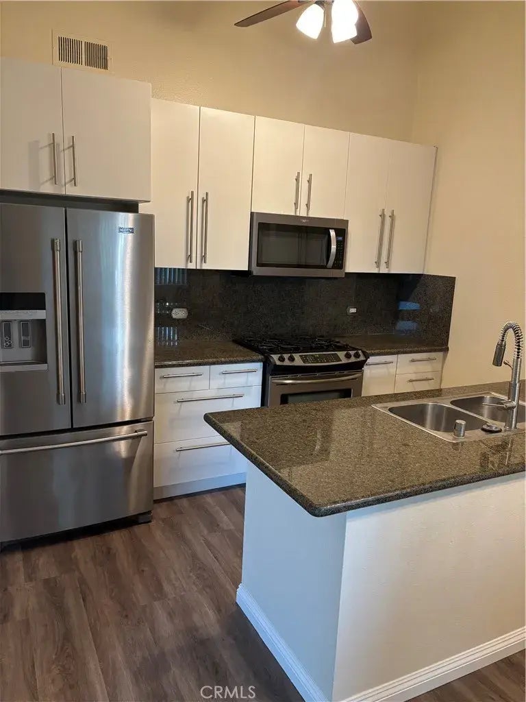 Los Olivos Townhome on second floor. This unit has been significantly upgraded and is ready for occupancy! New paint throughout, new blinds, new microwave, Refrigerator remains, new master bathroom shower! Flooring is higher end vinyl laminate that is 5 years old, cabinets and countertop were upgraded about 5 years ago, R/O system installed, AC condenser changed out 5 years ago. Dual pane windows throughout that are around 3 1/2 years now. HOA has a tennis court, pickleball courts, gym, 2 pools, spa and covers trash, water and hot water.