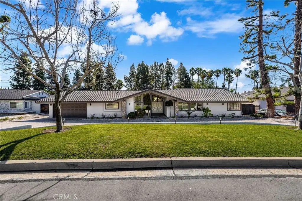 Welcome to this exquisite single-level ranch-style home, thoughtfully designed for comfort and convenience. This completely renovated property showcases modern updates throughout, offering a fresh, move-in-ready feel. Curb appeal is enhanced by an elegant pull-through driveway with paver stones, providing ample parking space, while a spacious 2-car garage offers secure parking and extra storage. Step through the grand double-door entry to discover a welcoming interior featuring new luxury vinyl flooring that's both stylish and easy to maintain. The heart of the home offers a stunning double-sided stone fireplace, serving as a cozy centerpiece for both the living and family room areas. The brand-new gourmet kitchen is a chef's dream, complete with sleek cabinetry, premium countertops, and state-of-the-art appliances. This home's infrastructure has been meticulously upgraded, including new PEX piping, an enhanced drainage system for the new yard drain, and a roof refreshed with new paint and coating for extended durability. Energy efficiency is prioritized with an brand new instant water heater, a newer AC unit, and dual-pane windows throughout. The exterior has been freshly updated with new stucco and paint, while inside, you'll find a super-sized laundry room with extra storage, new blinds throughout, and elegant plantation shutters in the primary bedroom. Outdoor living is equally impressive with a sparkling swimming pool protected by a security gate. Located near top-rated schools (Laguna Road Elementary, Park Junior High, and Sunny Hills High) and just minutes from sceni
