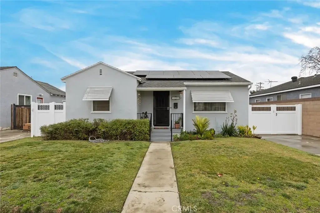 MOVE IN READY! This beautiful home stands out as one of the finest in the area, offering endless potential for your future. Step into luxury with a contemporary design that boasts inspired upgrades for ultimate comfort and a homey feel. The house features 3 spacious bedrooms and 2 beautifully appointed bathrooms. The Master bedroom is a true retreat with its private bath and generous closets. The bathrooms have been remodeled to perfection with modern fixtures, sleek ceramic tiles in neutral patterns, and frameless shower enclosures. This home maximizes functional space and is bathed in natural light thanks to its double-pane windows and panorama window awnings, which also help reduce solar heat and lower energy bills. The interior dazzles with brightly painted walls and ceilings, natural hardwood floors, recessed lighting, ceiling fans, accent lighting, and elegant base moldings. The kitchen is a chef's dream, flaunting a trendy quartz countertop, full backsplash, undermount stainless steel sink, extended charming breakfast bar, and natural oak cabinetry. Adding even more value, this property is equipped with solar panels installed in 2022, worth approximately $30k, ensuring significant savings on energy bills and promoting an eco-friendly lifestyle. The exterior boasts a delightful patio decking area, perfect for a daily outdoor retreat, whether it's for afternoon relaxation or a morning coffee station. Enjoy the serenity of a luscious backyard filled with healthy fruit-bearing trees and vibrant floral plants. The garden is a true oasis, especially during springtime, and