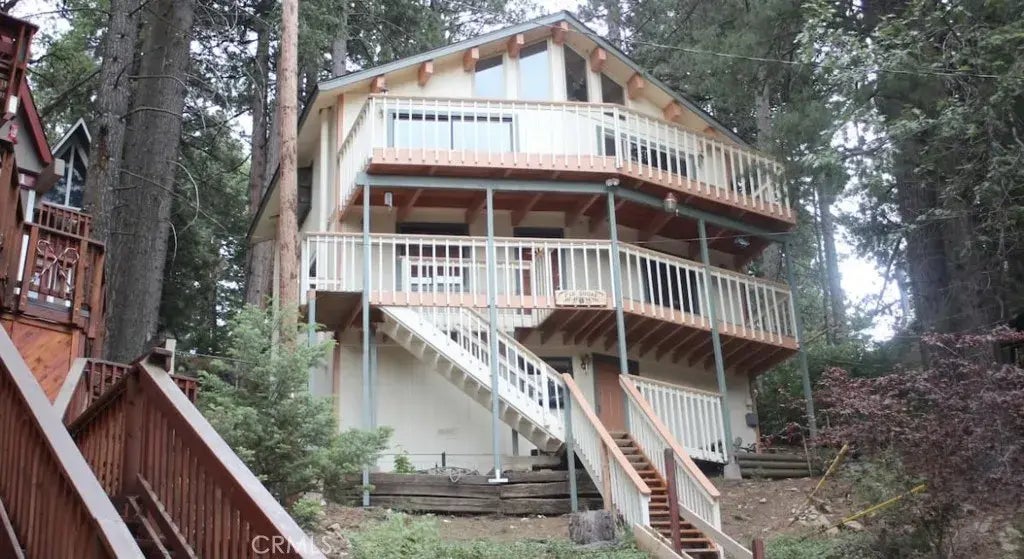 Conveniently located in between Lake Arrowhead and Big Bear Lake in beautiful Running Springs! This 2 bedroom 2 bath home has amazing views of the forest. It features an open floor plan upstairs for entertaining guests with high beamed ceilings, tall windows, and lots of natural light. There is a total of 4 separate decks, a separate storage room that can be converted into a 3rd bedroom, a parking carport, laundry room, and just a short drive to Snow Valley Ski Resort! Very central to the main town and so much more.