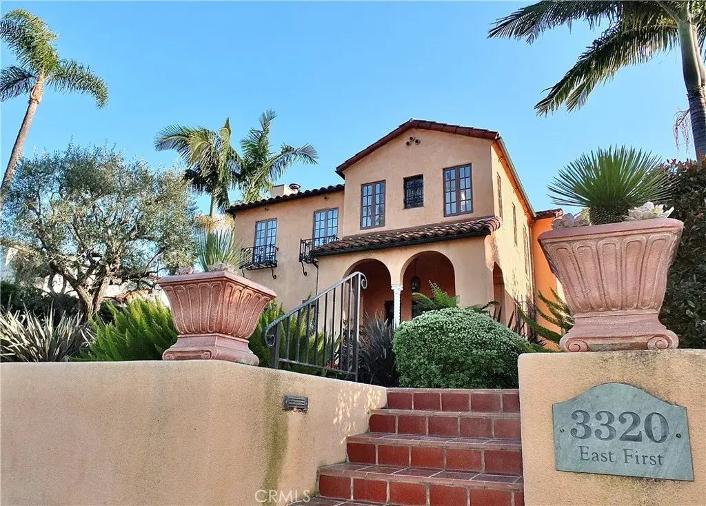 Welcome to this stunning, Mediterranean Moorish Beach Villa exuding an aura of romance, old world design flourishes and exquisite craftsmanship of the Spanish Revival architecture. This one of a kind home was designed by the iconic architect Joseph H. Roberts. Built in 1927, the approx 3,158 square foot property (inclusive of a casita) sits on a sprawling grassy knoll, blending historic charm with modern sensibilities and located just one block from the beach! The two story house (approx 2,598 square feet) boasts a warm and inviting living room, and an elegant dining room that opens onto a terrace for al dente dining and a spacious chefs kitchen. Each room reflects an array of Andalusian details bearing the hallmarks of the Spanish Revival architecture. Features include original hardwood floors, walnut doors, coved ceilings, double-crown moldings, archways, wrought iron grills and railing, custom built-ins, exquisite glazed Portuguese tiles, French doors and windows, and terracotta-tiled roofing. A dramatic staircase leads to three bedrooms including a primary retreat with ensuite bath and an adjacent sitting room and balcony access that overlooks the enchanting rear gardens. Two additional bedrooms and a tastefully remodeled bathroom make this home ideally suited for enjoying comfort and sanctuary.The gourmet kitchen includes a large central island, custom walnut cabinetry with granite counter tops, accented by glazed Portuguese tiles and rustic terracotta tiled flooring, stainless appliances and a SUB ZERO refrigerator. French doors open to a backyard oasis providing an o