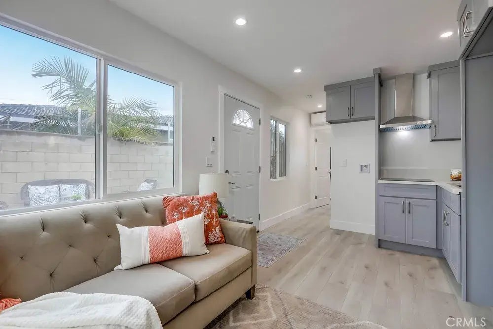 Brand New Darling private Accessory Dwelling Unit (ADU) with new courtyard and side yard. Enter through your own private entry gate. Open space Light and bright Kitchen with new range and oven, built in microwave, and New Quartz Countertops. Washer/dryer hook-up. New luxury vinyl wood flooring throughout. New Dual Pane Windows. Family room has air conditioner unit which cools off whole house and sliding door to courtyard where you could put a BBQ and table or patio furniture for entertaining. The new bathroom features beautiful shower with new ceramic tile floor to ceiling and window. Enjoy a large mirrored closet and large window in the separate bedroom. A MUST SEE!