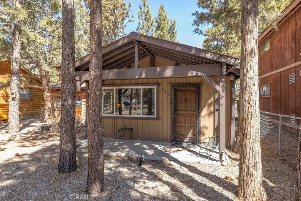 Tucked away among the trees and set back from the street, this charming single-level 2-bedroom, 1-bath cabin offers the perfect blend of cozy comfort and mountain character. Step inside to find beautiful tongue and groove wood accent walls, a native rock fireplace that adds warmth and charm, and a beautiful stained glass window, bringing a splash of color and light to the living room. Updates and upgrades include newer laminate flooring throughout, a new water heater, a brand new roof, new windows, upgraded plumbing and a new front porch and back patio. This house truly reflects pride of ownership!! Whether you're looking for a peaceful mountain getaway or a full-time residence, this hidden gem offers both charm and convenience in a peaceful Big Bear setting.