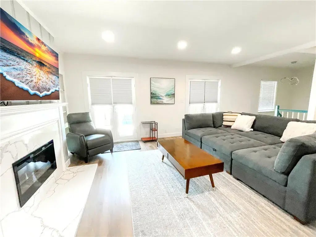 Beautifully remodeled from top to bottom, this modern two story townhouse features a unique blend of elegance, comfort and privacy. As you walk into the home you have your own entry room, perfect for storing away your coats, hats, and your sand filled shoes. Walk up the elegant staircase to the main floor of the house to experience the modern cape cod feel of bright whites and light grey tones throughout. The kitchen, which is the heart of this home, features stainless steel appliances, an oven with air frying feature, 4 burner range top with griddle, smart fridge and high end dishwasher. No expense was spared with technology: 60" LCD Samsung Smart TV with AppleTv, dimplex HD E-Fireplace system and smart home features in the kitchen appliances. The primary bedroom, which has a wall full of closets and a ceiling fan, is adjoined to an elegant bathroom with a bath tub, rain shower, large vanity and marble walls. The second bedroom is privately situated on the other side of the unit with another remodeled bathroom. The third, smaller bedroom serves as a multi purpose room with a general electric washer/dryer, a small work table and collapsible bed for a guest. The breathtaking, extra large rooftop patio is directly accessed from the two French doors in the living room. Seating for seven on a table is perfect for those who want to relax outside and soak up the warm SoCal sun while smelling the fresh ocean breezes. A 10 foot retractable sunbrella covers the area when desired and you can enjoy the master cook barbecue grill on this private patio during the day or late afternoon.