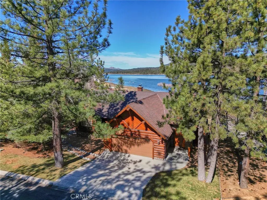 Charming Lakefront Log Cabin on Big Bear Lake with breathtaking panoramic views of the lake and surrounding forest. If you've been dreaming of a classic log cabin by the water with your own private dock, this is the place! Featuring 3 bedrooms and 2 full bathrooms, the home boasts a spacious great room with a dramatic floor-to-ceiling rock fireplace, plus a game room with a large dining area and a breakfast bar at counter height. Step outside to the expansive back deckperfect for stargazing, grilling, or even working remotely while enjoying the lakefront scenery. The deck is accessible via two sliding glass doors in the game room, along with access from the living room and master suite. Wake up to stunning views and entertain in style, all while enjoying the natural beauty around you. The property also offers an attached two-car garage and ample storage space for kayaks, canoes, skis, and snowboards. The front and back yards are low-maintenance, featuring a sandy play area, grass, rocks, and irrigation. Inside, you'll find newer flooring, fresh paint, and gleaming kitchen countertops that add to the home's charm. Located in the desirable Eagle Knoll Estates, you're just a short walk from restaurants and shops. The community offers a park, tennis courts, a marina, and low HOA feesan ideal spot for lake living!