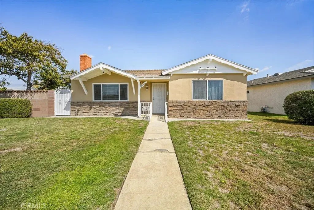 This exceptional one-story home offers 3 bedrooms and 2 bathrooms within 1,340 sq. ft. of living space on a 6,468 sq. ft. lot. Move-in ready, this residence boasts an inviting open floor plan that seamlessly connects the entrance, a spacious living room with a cozy fireplace, and a well-appointed kitchen. The kitchen features granite countertops, a center island, plenty of cabinets and stainless steel appliances, along with a formal dining area that leads to an enclosed patio with laminate flooring and access to a private backyard perfect for indoor-outdoor living. The primary bedroom includes a bathroom. Tile flooring entrance in the living room, kitchen and bathrooms. Laminate flooring in all bedrooms. Crown molding and recessed lighting and mirror closet door in bedroom. Fresh interior and exterior paint provide a modern touch. Fruit tree in the side yard, low maintenance front and backyard, detached two-car garage and a storage room. Conveniently located near shopping centers and the 405 Freeway, this home offers both comfort and accessibility. Come see its outstanding features for yourself.