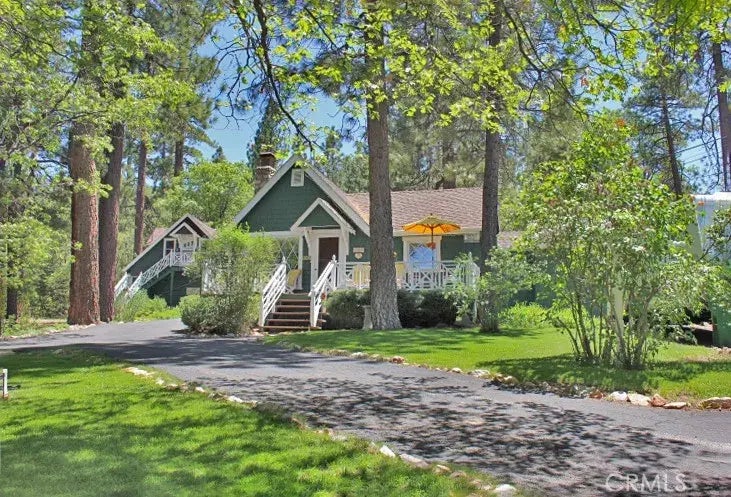 Remarkable historic cottage home is notably one of the most recognized Vintage properties in the valley. It was owned by the original Knight family & built for their granddaughter. This charming home is a primary residence. Main house features 1 bed/ 1 bath, mud room, airy cheerful open kitchen, w/ front porch & rear patio. The home is light & bright with original paneling, cozy fireplace and old world charm. Feel the warm inviting ambience the minute you enter the residence. The detached building boasts a rec room /workshop, 1/2 bath and one car garage as well as a guest suite upstairs w/ full bathroom, that currently is in the top 1% of all Big Bear Air BNBs for the last 10 years. Set on over one acre that is fenced, this adorable home is one you most likely have noticed over the years w/ it's parklike grounds, enchanted forest feeling, white fencing & gingerbread deck railings that add to the unrivaled ambience. Entire property has been lovingly maintained by the owners & include storm windows, Bali insulated blinds, auto irrigation, RV Parking, Workshop/rec room, 2 storage barns, & trex decking on the front porch. Per appraisal in 2025, house has 993 sq ft, guest house (428 sq ft), plus rec room (480 sq ft). The property is fabulous just as it is and will sell turnkey furnished. Future ideas include the possibility of subdividing the lot to build a large home and use existing buildings as rentals. Priced to sell quickly, come see this one of kind Big Bear dream.