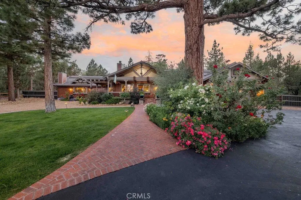 Over 1 acre of land, fully fenced & gated, with a beautiful park-like setting in the Meadowbrook Estates (acreage) neighborhood of Big Bear. Peace & quiet are the norm in this area. Custom built Craftsman style home, wonderfully landscaped, with mature oaks and pines. Newer carpet and interior paint over the last few years. Solar panels (owned), for lower electric bills. Single level living with 3-bedroom suites plus a guest bedroom and bath. Separate laundry room & attached 2-car garage. Massive great room living area with floor to ceiling fireplace and vaulted wood ceilings. Open kitchen has granite counters, hickory wood floors, stainless steel appliances, including a double oven, and large breakfast bar area. Adjacent dining area and bonus area with convenient access to the front and rear yards. Primary suite is located on separate end of the home, with vaulted ceilings, large walk-in closet and open bathroom area with jetted tub, separate shower and dual sinks. The yard is magical, with terrific views out of the front, and a wonderful sense of privacy in the back. Set up for entertaining and enjoying with bocce court, kids play area, garden/greenhouse and orchard. Adjacent acreage parcel to the north is available for purchase as well.