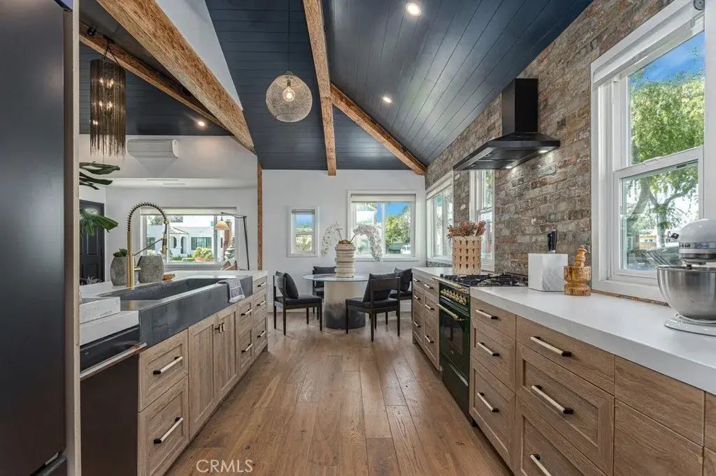 Welcome home to this beautifully restored historic California Bungalow Cottage, nestled in the heart of Old Town Tustinjust steps away from historic downtown shops, restaurants, and everything this charming neighborhood has to offer. Blending classic character with modern style, this single-level home has been thoughtfully renovated from top to bottom. Inside, youll find light-filled open living spaces with vaulted, wood-beamed ceilings and beautiful blonde oak hardwood floors throughout. The living area flows into a stunning kitchen, featuring soft-close cabinetry, an industrial concrete farmhouse sink, porcelain countertops, brick backsplash, and all high-end appliancesincluding a gorgeous emerald green Ilve range and brand new Caf refrigerator. Convenience meets comfort with an energy-efficient stacked Samsung washer and dryer discreetly tucked into the home. The layout also offers a cozy breakfast bar, dining nook, and sleek industrial lighting for that perfect blend of old-world charm and modern flair. Each bedroom offers something specialone includes a fun overhead loft for sleeping or extra space, while the other has custom built-in cabinetry and closet storage. The spa-like bathroom features a cast iron clawfoot tub, an open rain shower, and elegant ebony marble tile flooring. Step outside and unwind on the recently expanded front deck, or enjoy the shade of the elm tree during the warmer months. Theres also a built-in storage unit in the backyardperfect for bikes, tools, or extra belongings. Living here means embracing the vibrant lifestyle of Old Town Tustin. Walk