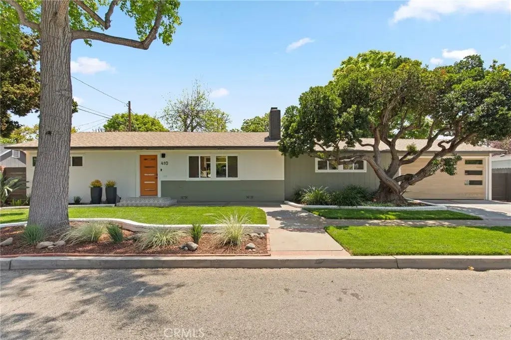 Welcome to 410 E Virginia Ave, A Stylish Mid-Century Ranch with Modern Upgrades in Park Santiago. Step into this beautifully renovated 1950s ranch-style home in one of Santa Anas most sought-after neighborhoods. Designed with todays discerning homeowner in mind. Inside, you will find an entertainers dream layout featuring an open-concept living and family room, centered around a striking fluted wood like tile fireplace, perfect for gatherings or quiet evenings at home. The wide-plank white oak wood flooring, dual pane windows with black-framed sliding glass doors, custom built-in media cabinet and wood wall accents create a refined yet relaxed vibe throughout. The chefs kitchen is the heart of the home, boasting a stunning waterfall quartz island, zellige tile backsplash, two-tone cabinetry, KitchenAid appliances, including a high-end commercial-style gas range, built-in under cabinet microwave, wine/beverage fridge and pot filler. Enjoy the serene garden views from the kitchen window while cooking, or dining. Many rooms of the home exhibit lush garden views and this floor plan lends for a seamless indoor/outdoor lifestyle. Every bedroom offers a generous amount of closet space, and the home includes solar tubes offering tons of natural light, all-new interior doors, light fixtures, 6-inch base molding and recessed lighting throughout. The primary suite features dual vanities, custom linen storage, large walk-in shower with pebble tile floor and tasteful fluted wood like tile detailing for a spa-like feel. Set on an oversized 8,500 sq. ft. lot, the park-like backyard is you
