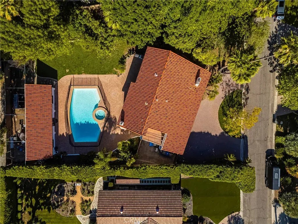 Discover this beautifully designed Mediterranean-inspired estate offering timeless architecture and exceptional indoor-outdoor living on a generous lot of over 21,000 sq ft. Located in the tranquil Orange Hills community, this home features approximately 3,036 sq ft in the main residence plus a second building which is a 799 sq ft pool house/Casita, ideal for guests, multigenerational living, or a creative studio or just a place to extend your pool party and lounge around indoors. The front exterior boasts a circular paver driveway, mature landscaping, and wrought iron and wood gates with direct access to a 3-car garage and extended parking and arched entry welcomes you into the homes elegant interior through solid wood double front entry doors. RV access through a back road to the property. A classic concrete and mortar tile roof and Venetian plaster exterior. Step inside to find soaring ceilings, leaded glass accent windows, terracotta tile and wood floors, and striking architectural lines. The layout includes a step-down living room with a cozy fireplace, a spacious elevated formal dining area, and a warm family room with another brick fireplace and access to the backyard. The kitchen is outfitted with stainless steel appliances, custom cabinetry, tile countertops, and views to the pool and lush yard. Upstairs, the oversized primary suite includes vaulted ceilings, a large walk-in closet, and a bath with dual sinks, a tiled shower, and vanity. Secondary bedrooms are privately positioned and include unique features like a balcony and garden views. Step outside to your own