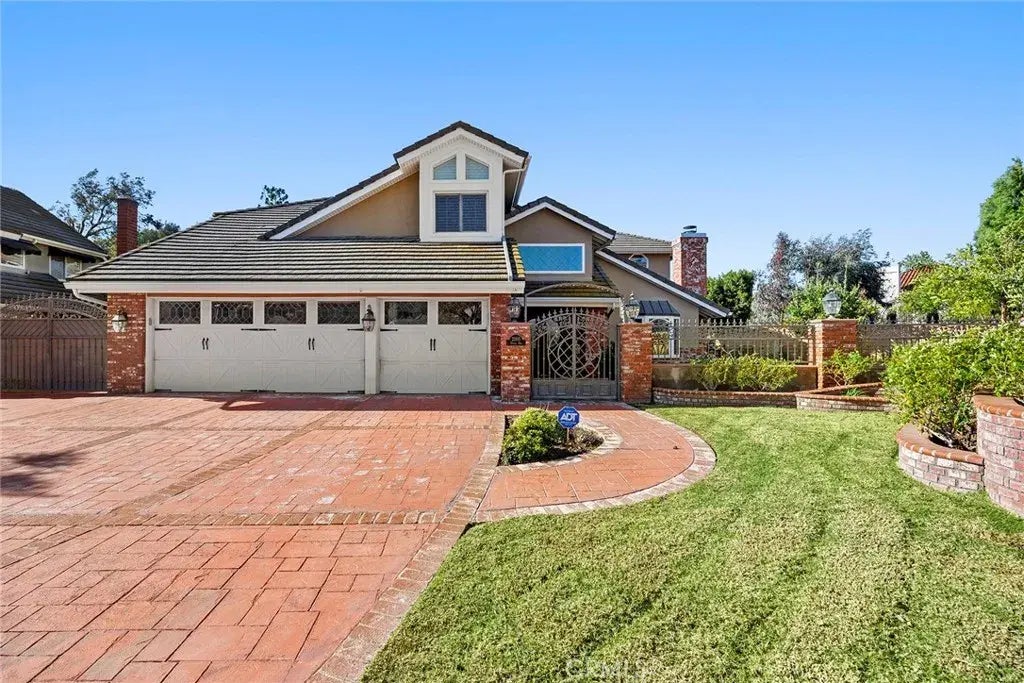 Absolutely stunning home on a large premium cul-de-sac lot, situated in one of the most desirable neighborhoods in Yorba Linda. This light and bright Warmington-built home exudes warmth, character, and an open spacious floorplan. Enter through the gated courtyard to the double door foyer with two story ceilings, chiseled-edge travertine stone flooring and custom millwork with wainscoting and encased posts. Large living room with vaulted ceilings, warming fireplace and expanded dining room surrounded by gorgeous custom beveled glass French doors. Modernized chef's kitchen with white lacquered cabinetry, quartzite countertops, and clean white subway backsplash. The fabulous kitchen is complete with plentiful storage, pullouts, stainless appliances and built-in refrigerator, all open to the family room and overlooking the beautiful, tranquil backyard setting. The family room opens up to the entertainer's yard and has an abundance of recessed lighting, gas fireplace and built-in niches. The lower level is complete with main floor bedroom and updated 3/4 bath. Striking wrought iron stairs lead up to the 4 additional bedrooms. Large primary suite with view balcony and a luxurious bath arena with soaking tub, walk-in shower, his and her vanities and convenient make-up station and dual walk-in closets rounding out the desirable amenities offered here. The front bedroom is a game room-sized room with vaulted ceilings, window seat and large walk-in utility room with laundry and full storage room. Two additional large bedrooms with large full hall bath complete the upper level of this