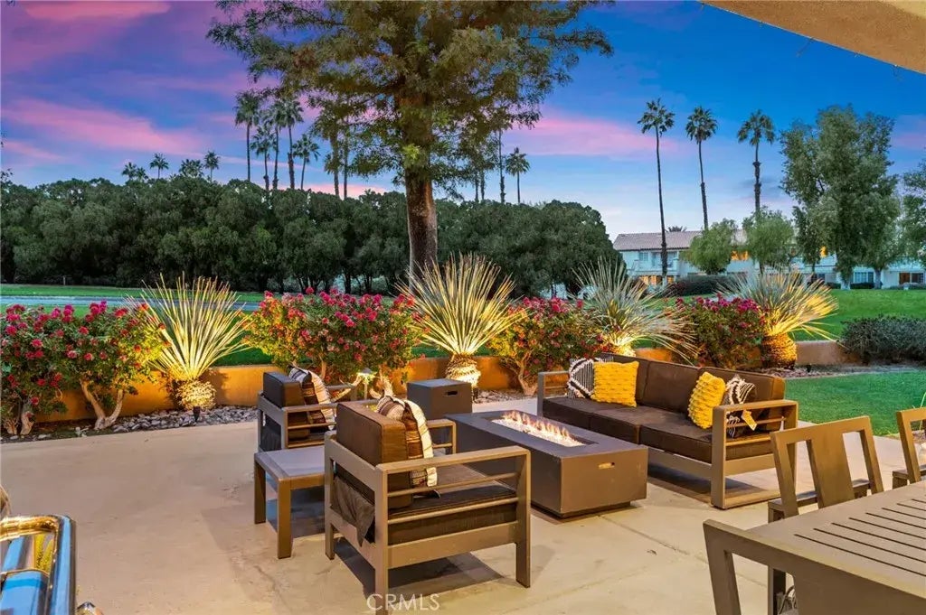 75641 Grahamstown Lane is a beautifully appointed 3-bedroom, 3-bathroom home perfectly situated on the 9th tee of the prestigious Avondale Golf Club in Palm Desert. This stunning property blends the best of indoor-outdoor desert living with privacy, comfort, and golf course views. Step inside to a bright and airy open-concept living space, where double sliding doors create a seamless flow between indoors and out. The living room features a cozy sectional, a 55-inch Smart TV, and sightlines to both the front courtyard and backyard. The kitchen is well-equipped with stainless steel appliances, a dual sink, breakfast bar seating, and plenty of storageperfect for both everyday living and entertaining. Each of the three bedrooms features its own ensuite bathroom. The spacious primary suite includes direct access to the private, gated pool and spa, a king-size bed, walk-in closet, dual vanities, and a large shower. A secondary bedroom features a queen bed and private bath, while the third bedroom is ideal as a guest room or home office, with a built-in work desk, Smart TV, and queen-size pullout sofa. This property also features a 2-car garage, plus an additional golf cart garage. The beautifully landscaped front courtyard is a private retreat, complete with a sparkling pool, spa, fire feature, lounging areas, and misters for warm desert days. The backyard overlooks the fairway and features a built-in 4-burner BBQ, seating space and mature citrus trees that provide fresh fruit throughout the year. Avondale Golf Community is a private equity member-owned club with a an 18-hole cou