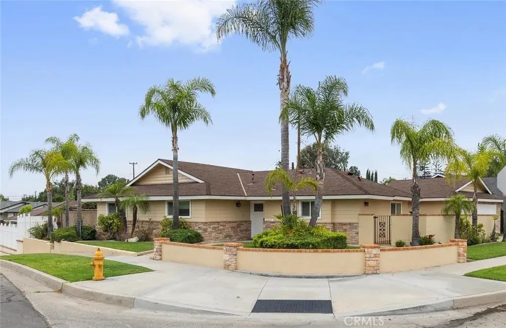 Delightful single story ranch home on an 8,500 sqft. corner lot ~ Recently installed plush Berber Dreamweaver carpeting, crown molding, enhanced baseboards, Fresh interior paint and etched windows give this charming home lots of character ~ Foyer entry into a formal living room with fireplace enhanced with a custom mantle ~ Lots of additional amenities include recessed lighting, dual paned windows, custom window shades and Plantation shutters ~ Light and bright remodeled kitchen features convenient center island, 5 burner Viking range with vent hood, sunny window, side entry sliding door to patio, stainless appliances and spacious dining area ~ Convenient inside laundry closet off the kitchen ~ Primary bedroom features remodeled private bath with walk in shower and above counter sink ~ Additional 2 bedrooms are ample in size and share a remodeled hall bathroom ~ Incredible rear yard with lots of room for casual living and dining areas ~ Covered patio surrounded with stone hardscape and manicured lawns makes this a entertaining back yard ~ Awesome exterior paint! This home has exceptional curb appeal!
