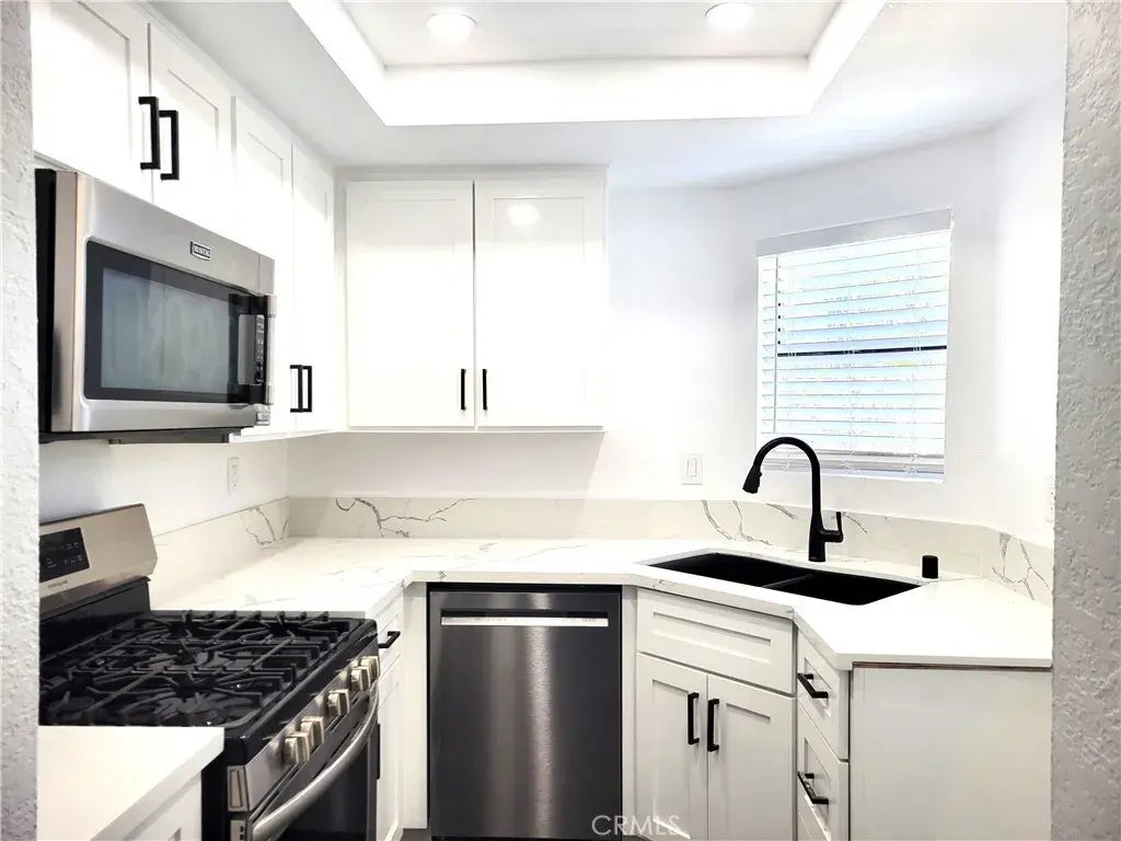Absolutely Gorgeous remodeled, upstairs, one bedroom condo with a spacious enclosed office that can be used as a bedroom. This second story unit features a painted interior with laminate floors throughout, a full remodeled bathroom with access to the bedroom and office, plus a remodeled kitchen with a new refrigerator, gas stove, dishwasher and built in microwave. Enjoy the warm, cozy fireplace, step out for fresh air on the adjoining balcony or turn on the air conditioning. So MANY options, including a private one car garage and community laundry rooms. Centrally located in a bustling community of shops, restaurants and department stores and it's a quick drive to the 405, 22 and 605 freeways.