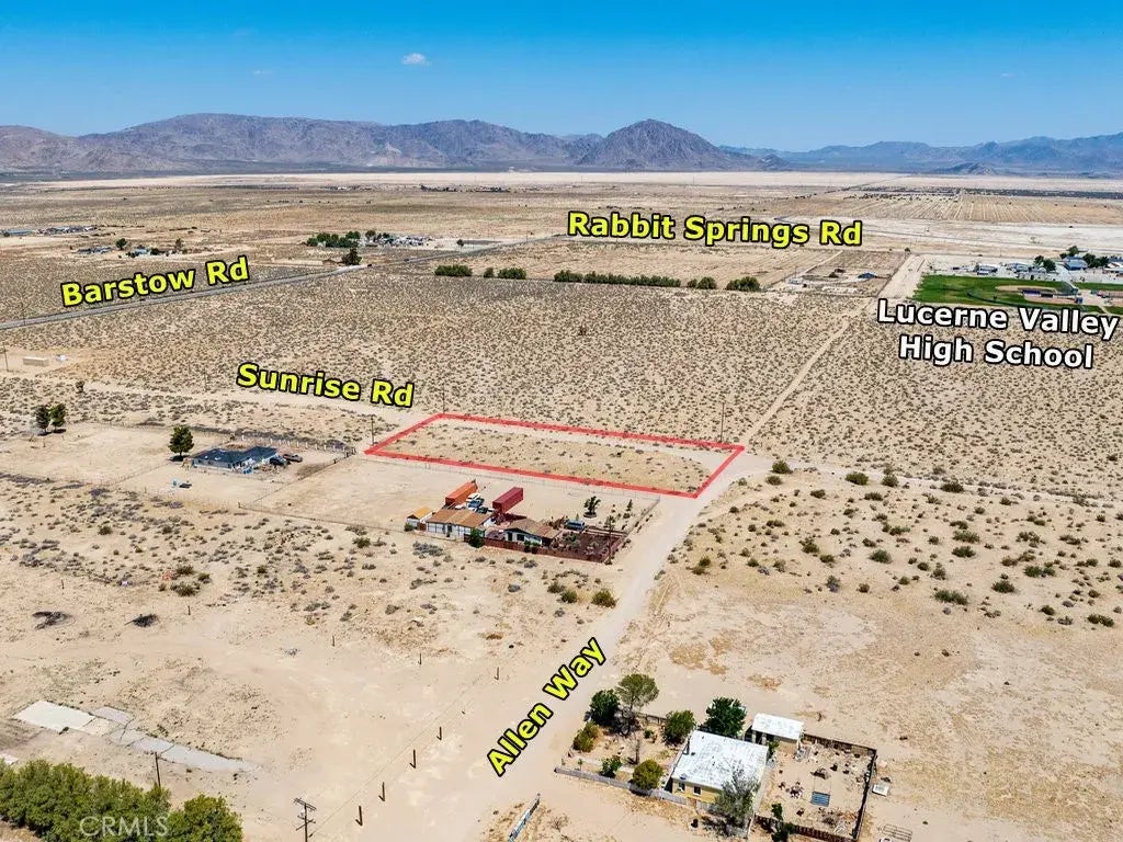 Great Location. Strategically located! Its about 1000 away from paved Barstow Rd and 0.5 mile away from Hwy 18 (Old Woman Springs Rd). It is also situated at the SW corner of Sunrise Rd and Allen Way. Power lines are on property and along Sunrise Rd while private well and septic tank are necessary and common in the area. Apple Valley, Victorville and everything you need is just a short drive away. This lot is in San Bernardino County jurisdiction and zoned for LV/RL (Lucerne Valley/Rural Living) which allows for single family homes and incidental agriculture uses. This is really an unique opportunity to enjoy a peaceful desert lifestyle with expansive open spaces and breathtaking natural beauty. Do not miss this opportunity to make your dream come true on this blank canvas. Please note that the boundaries represented in the photos are only an estimation. Buyers should verify boundaries, zoning and utilities, ensuring every aspect aligns with their vision for the property. Address has been assigned by county.