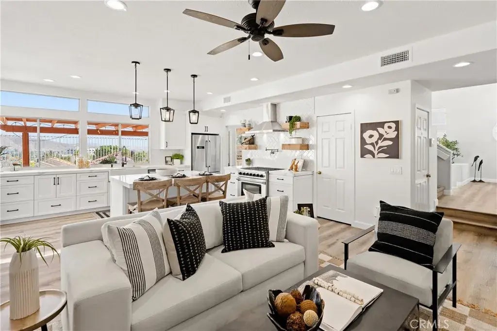 Tucked high up in the community of Corona Hills, this stunning J.M. Peters built home blends timeless design with fresh, modern upgrades. With approximately 2,327 square feet of living space, it offers four bedrooms and three bathrooms, including a main-floor bedroom and full bathroom, perfect for guests or multi-generational living. The entire main level has been beautifully remodeled in a warm, traditional style with trendy touches throughout. The custom kitchen features white shaker cabinetry, quartz countertops, designer pendant lighting, and stainless steel appliances that includes a freestanding Thor range and refrigerator. The bar, laundry room, and main floor bath have also been updated with thoughtful finishes that tie the look together. Step outside to sweeping views of city lights, rolling hills, and the distant mountains, an ideal backdrop for quiet mornings or evening entertaining. And when it comes to convenience, this location delivers. Just a short walk to Corona Hills Marketplace, Corona Hills Plaza, and the Country Side Center, with shops, dining, and daily essentials all close by. Sitting near the 91 and 15 freeway interchange, this home also offers easy access to Orange County, Temecula Wine Country, Palm Desert, and the local mountain resorts. A rare chance to enjoy designer upgrades, a functional layout, and incredible views all in one of Coronas most desirable hilltop neighborhoods.