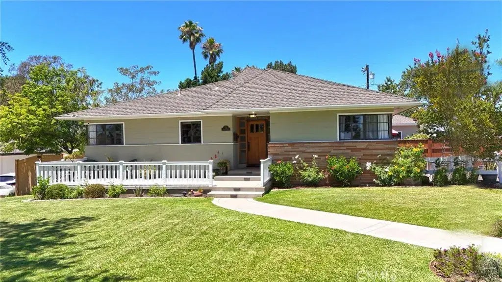 Welcome to this gorgeous, turnkey single-level home, a stunning example of Mid-Century Modern architecture, perfectly situated on an expansive 10,200 square foot corner lot. Offering 2,075 square feet of living space with 3 bedrooms and 2 bathrooms, this property blends classic style with modern comfort. Step into a spacious living room featuring high ceilings, a sunshade, a stone-faced fireplace, wood windows, accent lighting, and drapes. Adjacent is the versatile family room with a valance, which offers a bedroom three option, complete with luxury vinyl flooring, a stone-faced fireplace with a gas log, a beautiful beamed ceiling, and a ceiling fan. A dedicated office space boasts tile flooring, beamed ceilings, and convenient direct access to the backyard. The fabulous kitchen is a culinary dream, outfitted with pristine quartz countertops, a stylish subway tile backsplash, a farm sink, and premium stainless steel appliances, including a convenient pot filler. The laundry room features quartz countertops, a pantry, wainscoting, a utility sink, and direct access to the backyard. The primary suite is spacious, featuring a ceiling fan, drapes, and a walk-in closet. The primary bathroom maintains a charming retro tile aesthetic, complete with a tub and shower, a Roman shade, and a wall heater. Bathroom two showcases retro pink tile and sink, with a shower featuring a mosaic floor. Bedroom two is comfortable, equipped with a ceiling fan, drapes, and shades. This home is replete with other desirable amenities, including single plank hardwood floors, new baseboards, newer exteri