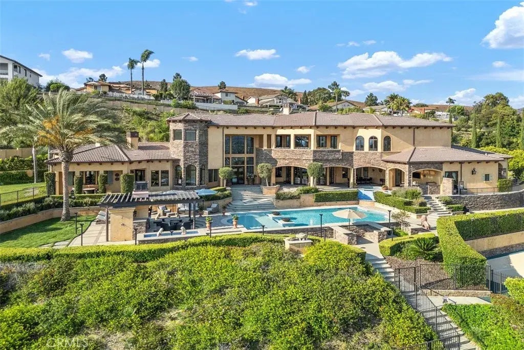Imagine this: your own private hilltop resort, unmatched ocean views and city lights, and Disneyland fireworks as your nightly backdrop. This isnt just a home its a lifestyle. A retreat where every piece was built to impress, entertain, and escape. Iconic. Private. One of a kind. A Southern California jewel that truly has it all. ********* Welcome to one of North Orange Countys most iconic private estates a Tuscan-inspired masterpiece set atop a secluded 5+acre hilltop, commanding unobstructed panoramic views from Catalina Island to the Pacific Ocean, rolling canyons, basins, and the glittering skyline of Disneylands nightly fireworks. Behind massive custom iron gates, a long private driveway ascends to this architectural showpiece a residence that seamlessly blends timeless craftsmanship with grand-scale living. The estates nearly 10,000 square feet of living space is a showcase of artisan finishes, soaring volumes, and meticulous detail. The heart of the home a dramatic chefs kitchen crowned by 30-foot barrel ceilings connects effortlessly to expansive living spaces designed for both intimate gatherings and grand entertaining. Walls of glass and French doors invite breathtaking vistas from every angle, framing a rare combination of elegance and natural beauty. The main-level primary suite is a private sanctuary offering a personal gym, retreat, spa-inspired bath with sauna, dual fireplace, and direct access to a private view deck. A stately executive office, 10-seat home theater, and poker lounge with city-light views complement the homes curated collection of luxury
