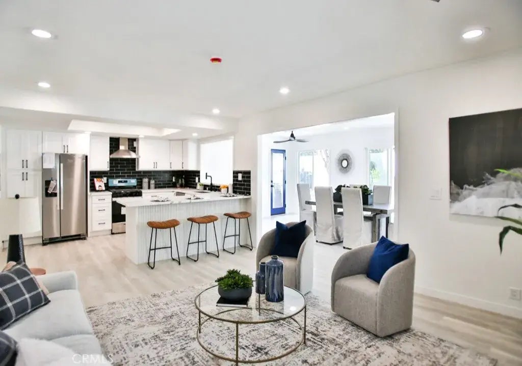 Don't miss this rare opportunity to own a beautifully upgraded and fully remodeled home with NO HOA in the heart of Tustin! This spacious 5-bedroom, 3-bathroom residence boasts 2,572 square feet of modern living space, thoughtfully designed with high-end finishes: recessed lighting, soaring foyer, ceiling chandelier, custom glass stair railings, dual pane sliding doors and windows, laminate floor, glass door showers, and an expanded family room with abundant natural light. There are 2 bedrooms downstairs, and 3 bedrooms including the Master (with a huge walk-in closet) upstairs. Located in a wealthy neighborhood near a scenic golf course, top-rated schools, and nestled between Tustin Legacy and the vibrant Irvine Marketplace, it offers easy access to groceries, shopping, dining, and entertainment. Enjoy weekend strolls to the nearby tree-lined park, perfect for families seeking both tranquility and community. This is quality living at an unbeatable value in one of Orange Countys most sought-after locations.