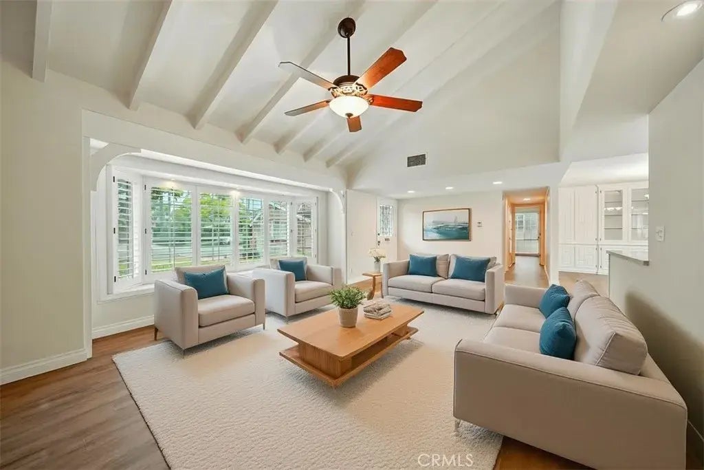 Welcome to this meticulously upgraded 3 bedroom 2 bath Rossmoor home. Close to all of the Blue Ribbon Schools, beaches, and of course freeway friendly. Step inside to the living room with its beamed ceilings creating a cozy and inviting atmosphere. The fireplace serves as a focal point providing warmth and ambiance on chilly evenings. Built in cabinets in the dining room offer plenty of storage space while also adding to the overall aesthetic of the home. The engineered flooring is not only beautiful, but also durable and easy to maintain. Fit for a chef, the kitchen with its quartz countertops, and stainless steel appliances gives the kitchen a sleek and modern look. With plenty of cabinet space and pull-out cabinets, there is ample storage for all of your cooking essentials. The double oven and built in microwave make meal preparation a breeze, allowing you to cook multiple dishes at once with ease. The updated bathrooms feature sleek glass enclosures and modern fixtures. The addition of the ceiling fans and shutters help keep the home cool and comfortable, making it a perfect space to relax and rejuvenate.