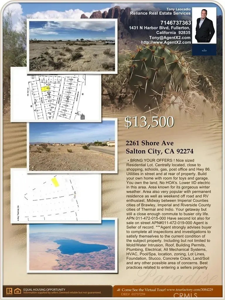 BRING YOUR OFFERS ! 11,669 SQ. FT. LOT ! Exceptionally centrally located, close to shopping, schools, gas, post office and Hwy 86. Utilities in street and at rear of property. Build your own home with room for toys and garage. You own the land, No HOA's. Lower IID electric in this area. Area known for its gorgeous winter weather. Area also very popular with permanent residence as well as weekend off road and RV enthusiast. Midway between Imperial Counties cities of Brawley, Imperial and Riverside County cities of Thermal and Indio. Your getaway but still a close enough commute to busier city life. APN 011-472-015-000 Have second lot also for sale on street APN#011-472-019-000 (not side by side) Call with any questions; English speaking- Tony 714-673-7363 Spanish speaking- Mayra 714-381-0989 Agent is Seller of record. ***Agent strongly advises buyer to complete all inspections and investigations to satisfy themselves to the current condition of the subject property. Including but not limited Building Permits, Plumbing, Electrical, location, zoning, Lot Lines, Land/Soil and any other possible area of concerns. Best practices related to entering a sellers property