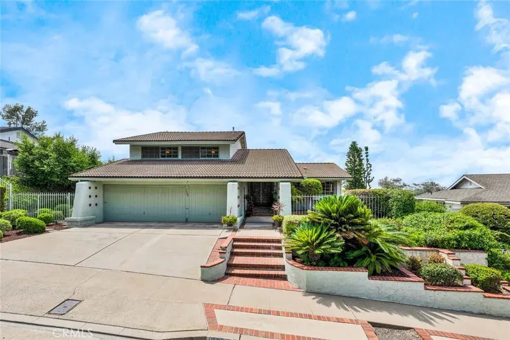 Perched in a prime location w/ breathtaking panoramic views of city lights, Catalina Island, the Pacific Ocean, and even Angel Stadium fireworks, this tri-level home blends timeless elegance with thoughtful upgrades. The freshly painted exterior & classic Adobe tile roof welcome you past professional, mature landscapingSego palms,colorful bougainvillea,rubber plants & manicured shrubsall nourished by a fully automated watering system. A brick stairway w/ bullnose edging & a lighted walkway lead to a spacious brick-pavered front patio,perfect for morning coffee or sunset conversations. Inside,the majestic double door entry opens to a hardwood-floored foyer & modern chandelier,leading into a light-filled living room framed by a wall of windows that showcase the spectacular views.The formal dining room,easily seating twelve, flows nicely into the kitchen,where cream-colored speckled granite,hardwood cabinetry,a full granite backsplash & a charming breakfast nook set the stage.Also a Butlers pantry,KitchenAid dual ovens, 4-burner cooktop w/ oversized vented hood,Whirlpool dishwasher,Kohler sink w/ newer fixtures,dual-pane vinyl windows,Hunter Douglas translucent coverings,recessed lighting & hardwood floors. The inviting downstairs family room offers parquet flooring,built-in bookshelves,plantation shutters & a fireplace w/ raised tile hearth,along w/ direct pool access through dual sliders.A downstairs bedroom w/ built-ins is paired w/ a beautifully updated bath featuring a retiled glass walk-in shower,ceramic tile insets,newer fixtures & hardwood cabinetry.The oversized 3-car
