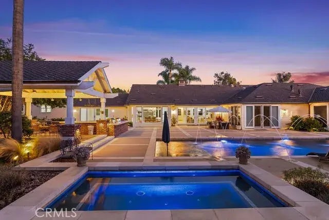 Set on nearly an acre of flat, gated grounds in the hills of North Tustin, 11581 Arroyo Avenue is a custom single-level estate that captures the essence of California luxury living. Offering more than 6,700 square feet of thoughtfully designed living space, this one-of-a-kind property was rebuilt and reimagined in 2012 to blend timeless architecture with modern design. Through grand double doors, soaring ceilings, travertine floors, wood-beam accents, and expansive windows create an open, light-filled atmosphere. A welcoming open office off the entry features French doors that frame views of the front gardens, providing the perfect setting for working from home. Formal living and dining rooms provide an elegant backdrop for gatherings and celebrations. At the heart of the home, the chefs kitchen boasts Sub-Zero and Wolf stainless steel appliances, three dishwashers, a hot water pot filler, a warming drawer, floor-to-ceiling custom cabinetry, a massive center island, a walk-in pantry, and a charming Dutch door that opens to the resort-inspired backyard. The primary suite offers a private retreat with a separate living room, fireplace, dual boutique-style walk-in closets, and a spa-like bath with soaking tub, frameless shower, and dual vanities, while each additional bedroom is en-suite for privacy and comfort. Entertainment is at every turn with a game room and a versatile play or pool room, both opening to the outdoors. Multiple French doors and floor-to-ceiling windows extend the living space outside to a backyard designed for resort-style living, featuring a sparkling poo